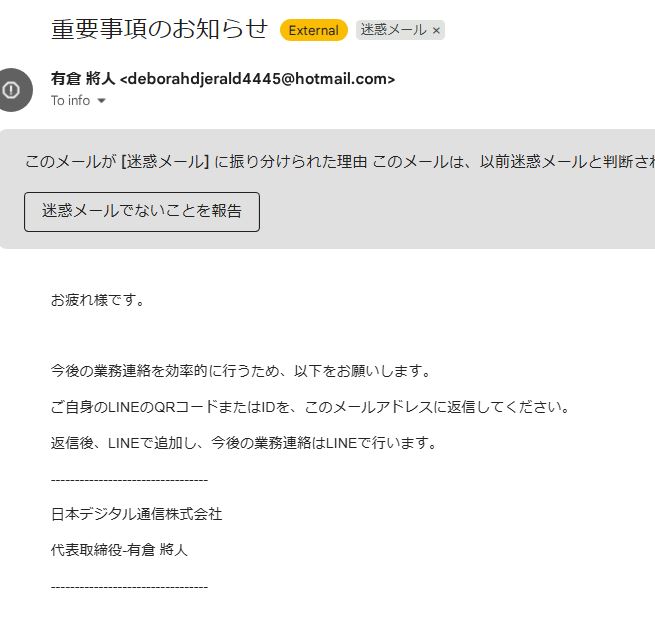 実際に弊社にも代表を名乗ったメールが届きました・・・😲💦
